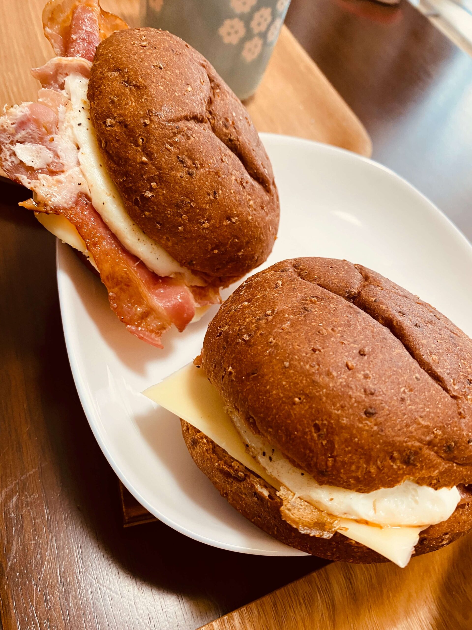 朝ごはんにピッタリ!栄養満点のチーズ月見バーガーです!