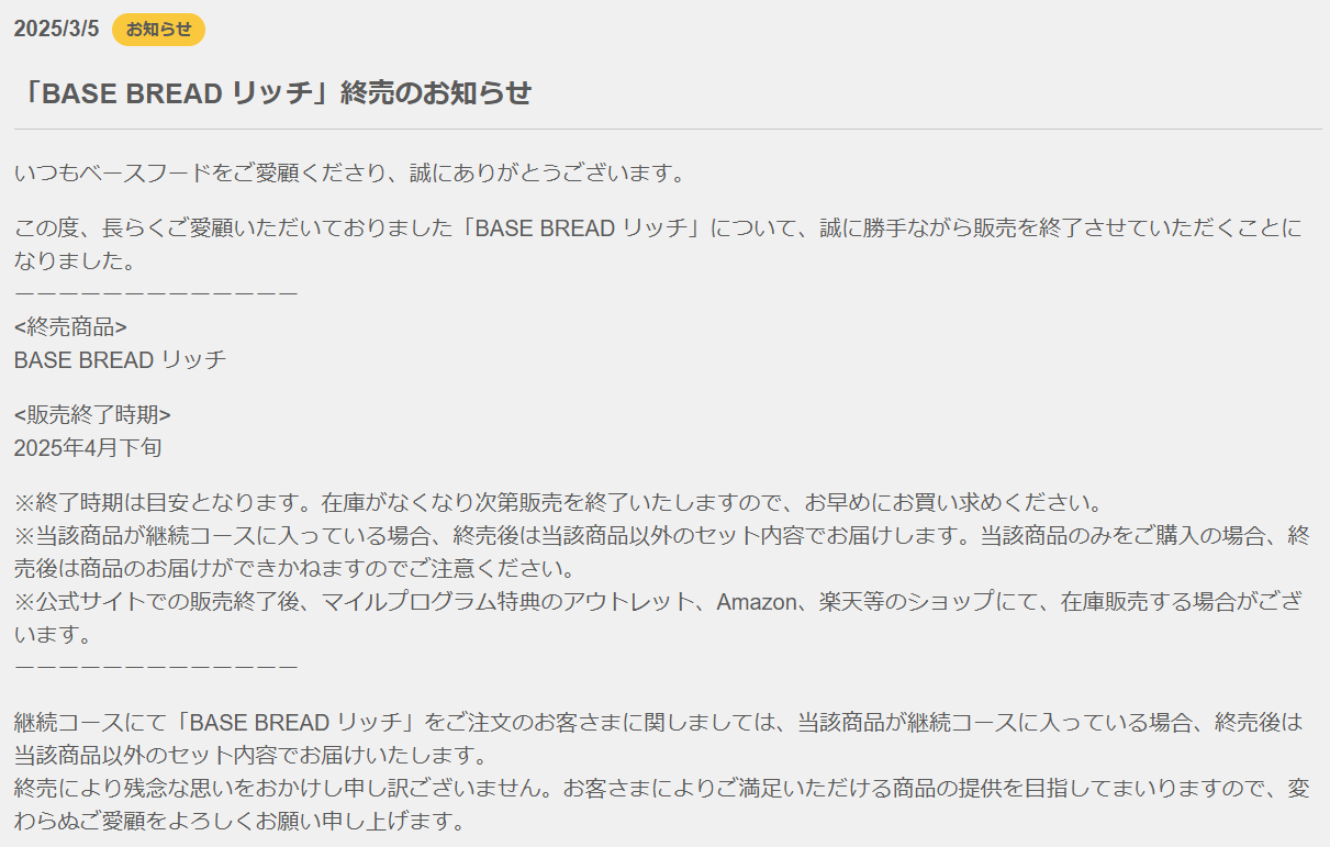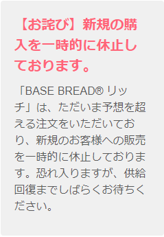「BASE BREAD®︎ リッチ」は、ただいま予想を超える注文をいただいており、新規のお客様への販売を一時的に休止しております。恐れ入りますが、供給回復までしばらくお待ちください。