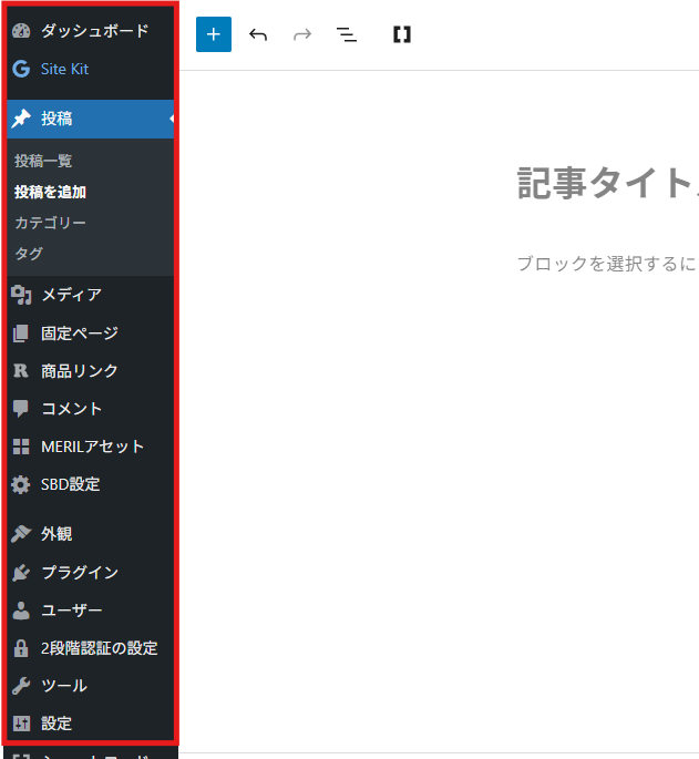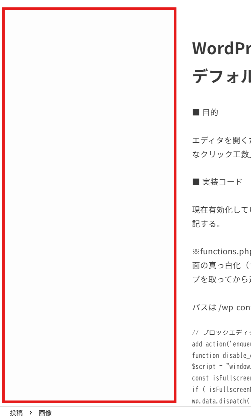 記事の新規追加や編集画面を開いた際、左側のWordPress管理メニューが常に表示された状態でエディタが起動する。