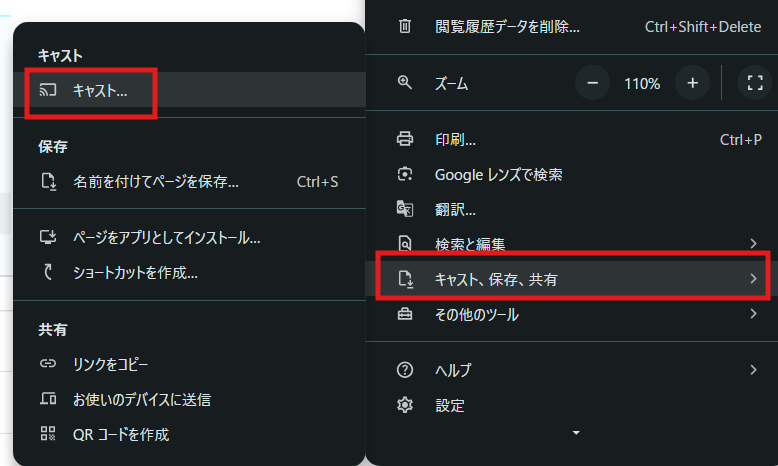 ※今現在Chromeの最新verでは【キャスト、保存、共有】 ⇨ キャストとなっています。